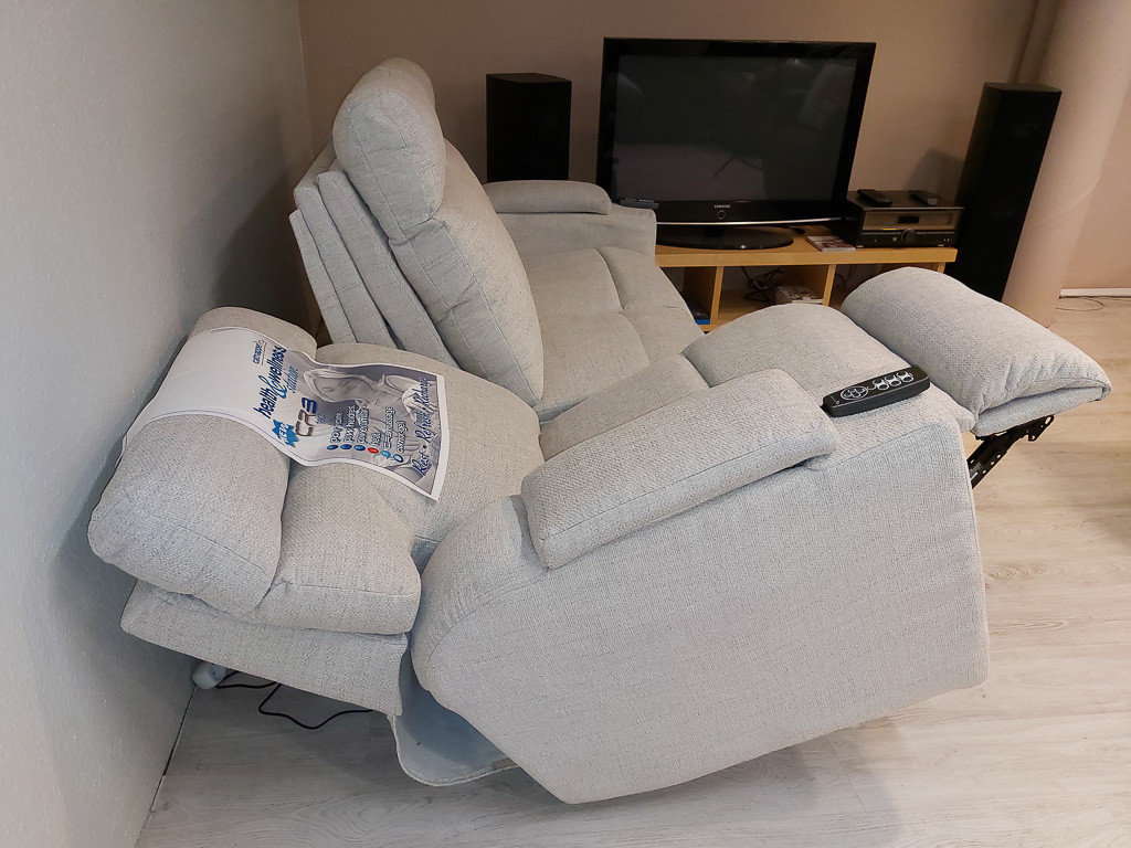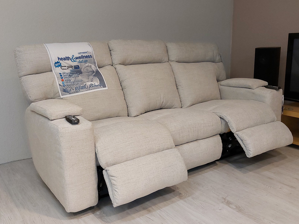 A Sanctuary 3 személyes kanapé szélső ülésein a relax mechanizmus motorosan emeli a lábtartót, dönti a háttámlát.