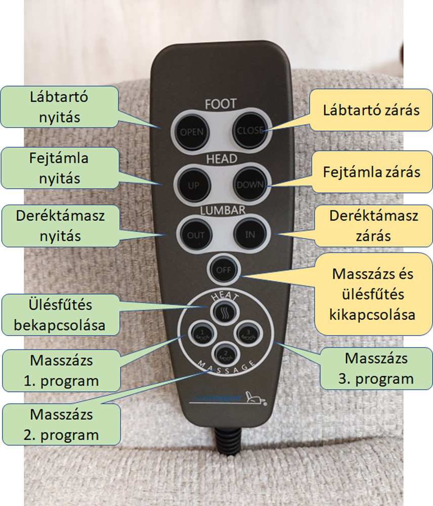 A vezérlés a beépített program szerinti ritmusban működteti a légpárnákat, a háttámla kárpítján át masszírozza az ülésben helyet foglaló derekát. A távirányító segítségével három massszázs program közül választhatunk.