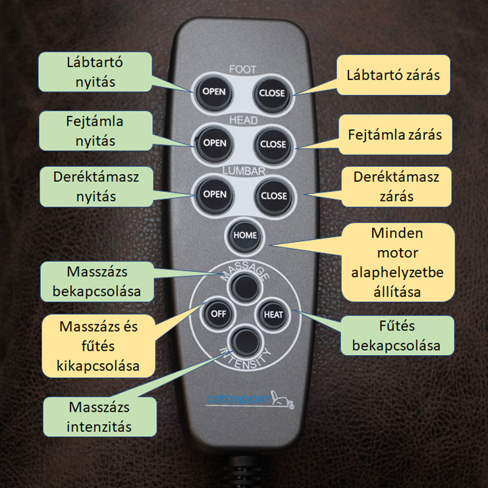 A kapcsoló panel közepén található kis méretű gomb megnyomására a fotel mindkét motorja az alaphelyzetre áll vissza.